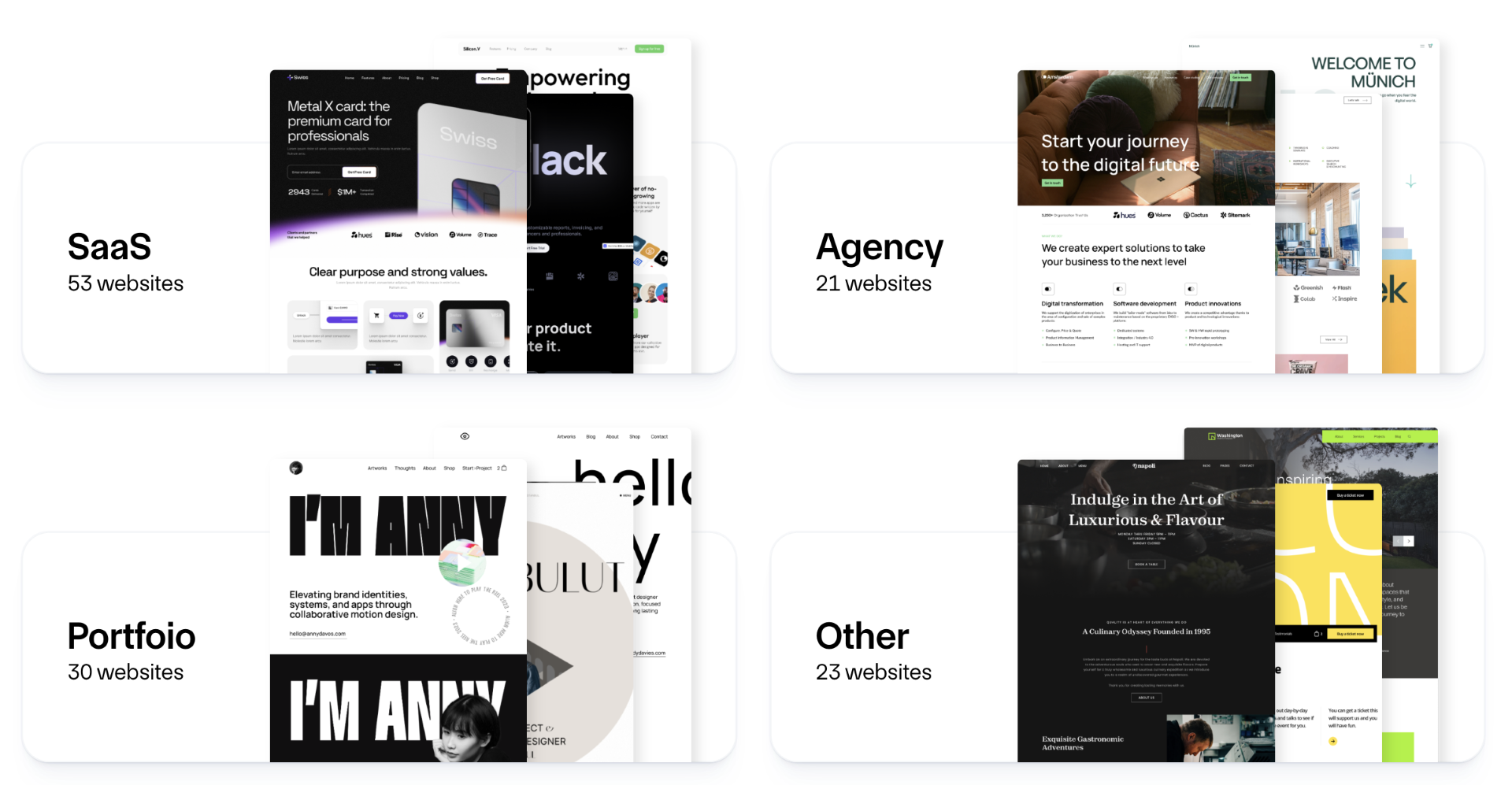 - 127 Website Designs: Covering a broad range of niches, including SaaS, Agency, Portfolio, Consulting, and Construction.