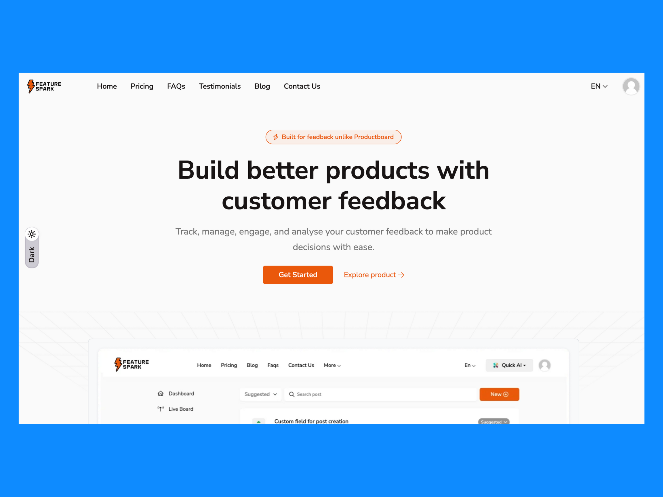 FeatureSpark is a powerful SaaS solution built on Laravel CMS that helps businesses efficiently gather, manage, and act on customer feedback. Whether you’re a startup refining an MVP or an established company improving customer engagement, FeatureSpark